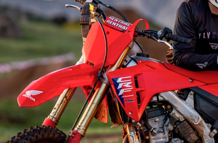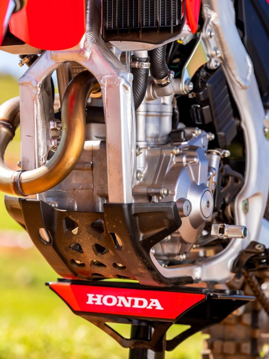The CRF250R’s large front-brake disc measures a whopping 260mm. You get great brake feel and a pattern that cuts down on weight. Front and rear brake-disc guards are part of the package too. And for 2025 a new front-brake caliper and piston seals give you more linear front-brake performance with less lever play.