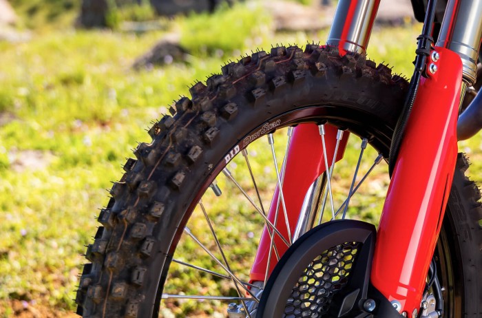 The 49mm Showa® fork features a conventional spring design that increases precision, handling and feel, while the rear has a Pro-link set up. Both fully adjustable and specifically tuned for off-road riding.