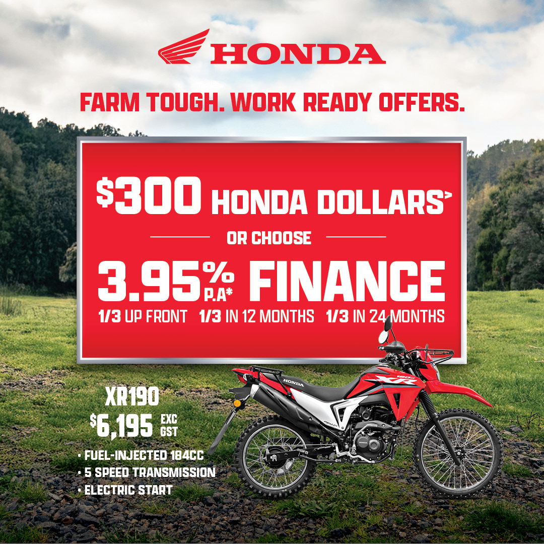 Get your next Honda farm workhorse sorted with an offer that works the way you do. For a limited time, when you purchase a selected new Honda ATV or 2 wheel farm bike, you can choose what suits your farm and your cashflow best.