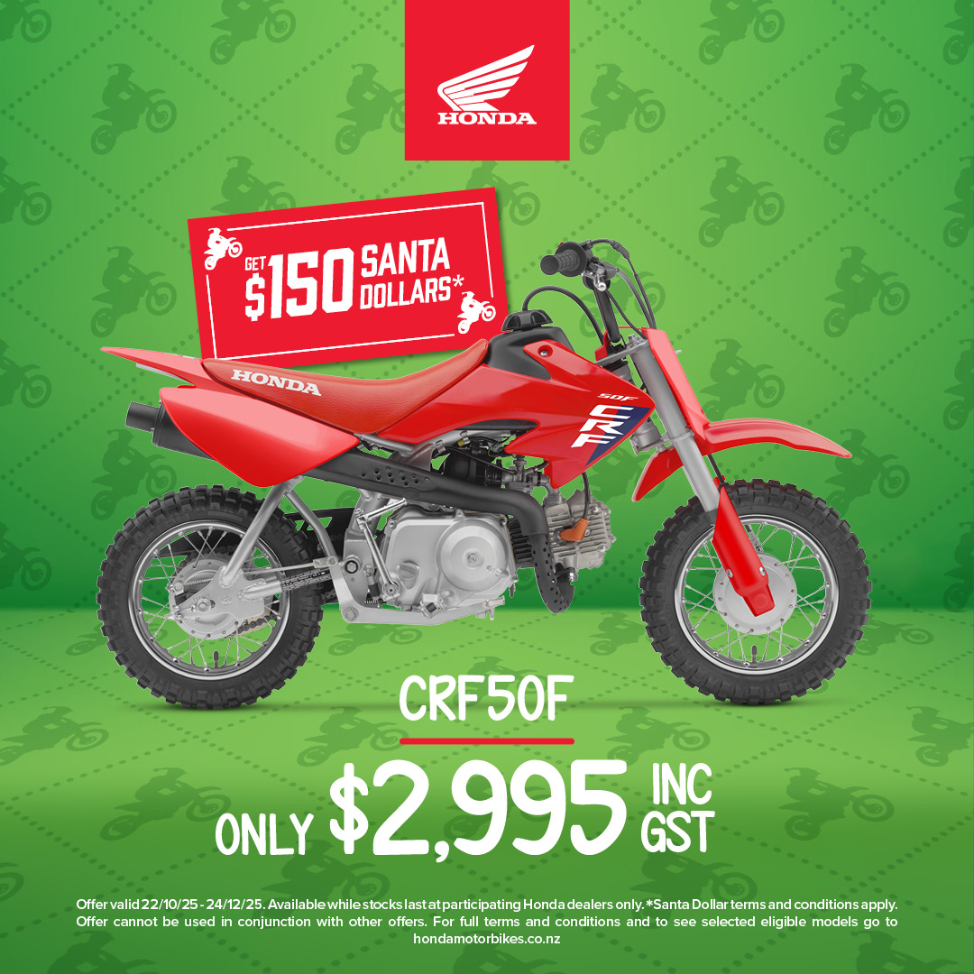 *Back pack full of gear includes Backpack, Cap, Power Pack, Torch Key Ring, Tyre Pressure Gauge Key Ring, Multi-tool Set and Drink Bottle. Offer valid 22/10/25 - 24/12/25. Available while stocks last at participating Honda dealers only. CRF50F (2025 Red & 2024 White/Pink) - Get $150 Honda Dollars + Backpack full of gear, CRF110F (2025 Red & 2023 White/Teal) - Get $200 Honda Dollars + Backpack full of gear, CRF125F (2023) - Get $1000 Honda Dollars + Backpack full of gear, CRF125FB Big Wheel (2025/2026) - Get $300 Honda Dollars + Backpack full of gear. **Honda Dollars must be spent instore at your local Honda motorbike dealer. Honda Dollars are valid till 31st March 2026 and cannot be exchanged for cash or any other equivalent. Offer cannot be used in conjunction with other offers.